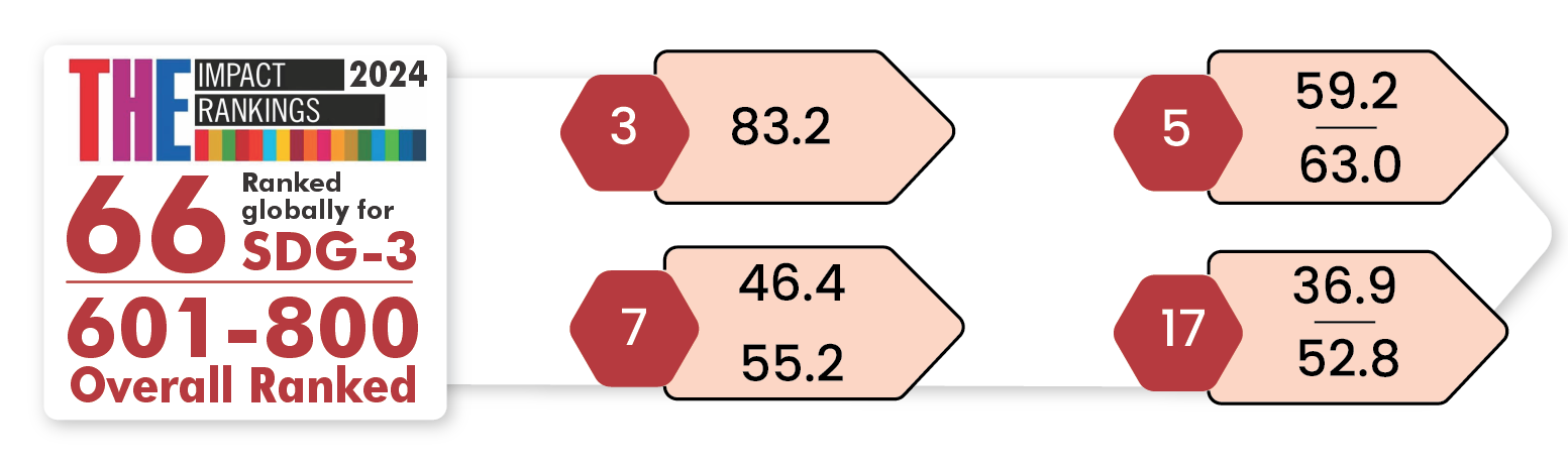 Achieved a rank between 601-800 in Times Higher Education Impact Rankings for 2024 in the SDGs 3, 5, 7 and 17.